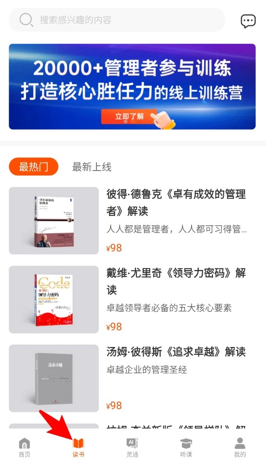 2、读书板块会为大家带来热门管理类书籍的导读内容,点击对应的书名就能跳转到详情页面查看更多信息。