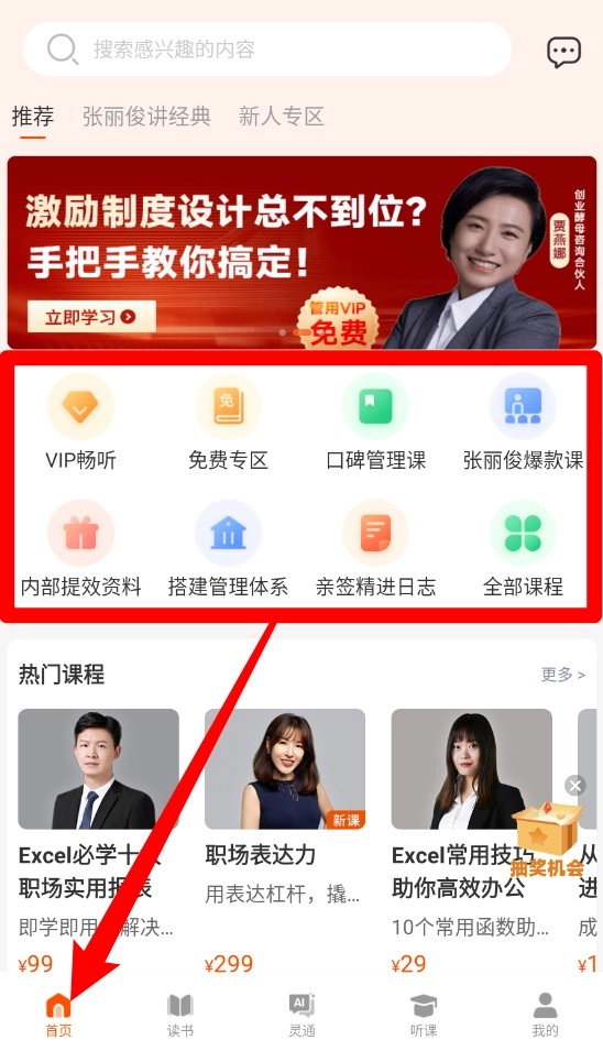 1、首页呈现推荐内容与课程分类,点击对应图标即可快速进入各类学习版块。