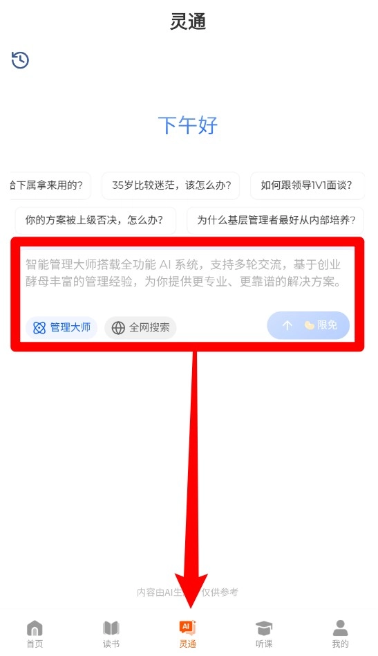 3、灵通页面集成了AI对话功能,能够支持对管理问题进行搜索并获取智能解答。