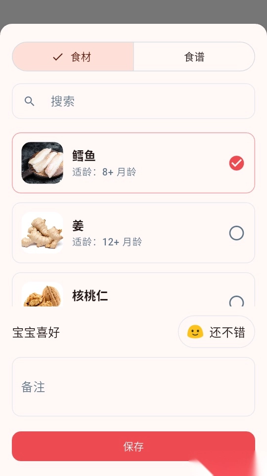 搜索食材和食谱后一键勾选,接着点击下方的“保存”按钮,即可成功添加。
