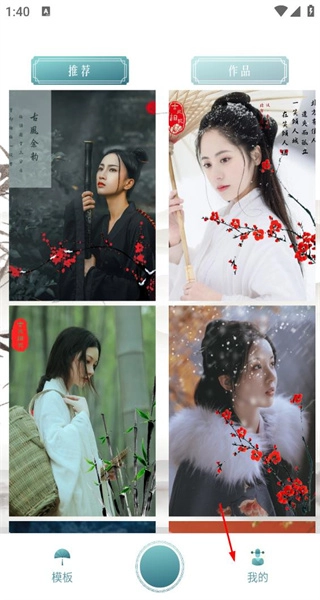 打开软件后,浏览推荐板块的古风图片内容,点击底部我的按钮,进入对应的设置页面。