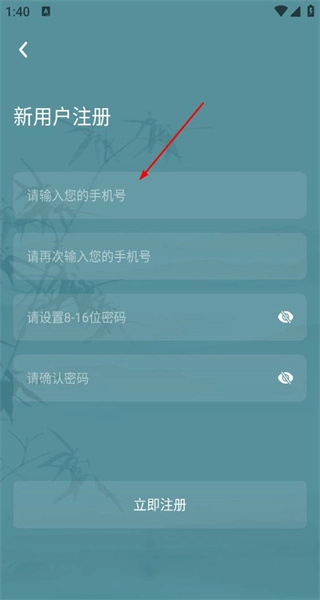 进入新用户注册界面,输入手机号码并再次填写以确认,设置满足要求的密码后,点击“立即注册”按钮即可完成注册流程。
