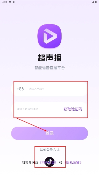 1、在【超声播】登录界面,先在对应栏位填写手机号,点击【获取验证码】并填入收到的验证码,再点击【登录】按钮完成登录;此外,也可通过选择【其他登录方式】来进行登录操作。