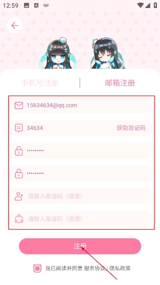 4、进入【邮箱注册】页面后,依次填写【邮箱】【验证码】【密码】等相关信息,勾选对应的协议条款,最后点击【注册】按钮,即可完成账号的创建流程。