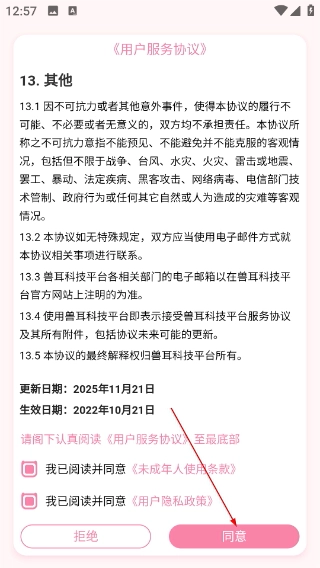 1、查看《用户服务协议》中“13.其他”条款后,勾选用户隐私政策相关选项,点击“同意”按钮即可完成协议确认。