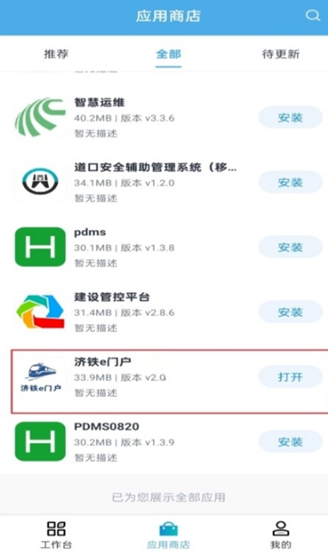 在选择“卓易通”作为打开方式登录“济铁应用平台”后,进入应用商店完成“济铁e门户”的安装操作。