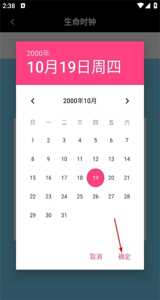 把日历调整到2000年10月,找到被标记的19日,点击底部的确定按钮,以此确认选择的出生日期。