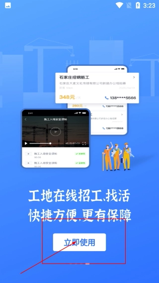 2、打开【冀建通-工人端】后点击【立即使用】,即可使用【工地在线招工-找活】功能,体验便捷又有保障的服务。