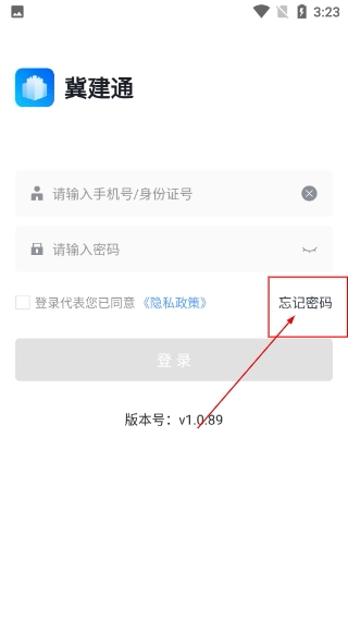 3、在【冀建通】登录界面,要是忘记密码了,可以点击【忘记密码】选项;另外,必须勾选同意【隐私政策】,才能完成登录操作。