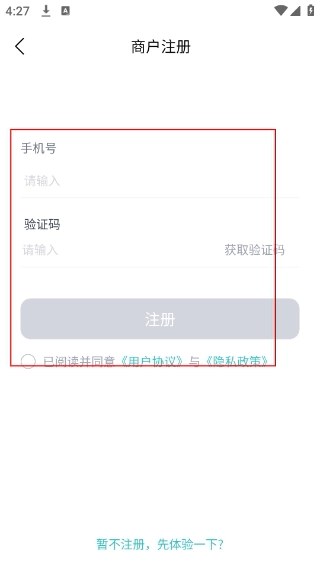 2、在【商户注册】页面,需输入【手机号】、获取并填写【验证码】,勾选协议后才能点击【注册】按钮。