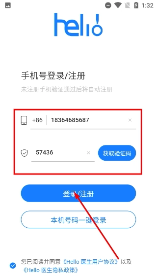 4、进入手机号登录/注册页面后,依次填写手机号和验证码,勾选相关协议,随后点击【登录/注册】按钮,即可完成账号的登录或注册流程。