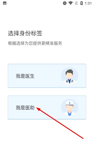 3、在身份标签选择页面,依据自身身份挑选对应的选项(例如【我是医助】),然后进入后续的登录或注册流程。
