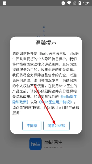 1、在温馨提示弹窗里,仔细阅读《hello医生隐私政策》和《hello医生用户协议》后,点击【同意并继续】按钮,即可进入应用的功能界面。
