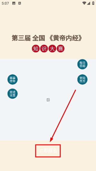 3、可借助【每日答题】【赛事榜单】等功能进行互动参与,点击【立即报名】按钮,就能完成第三届全国《黄帝内经》知识大赛的报名流程。