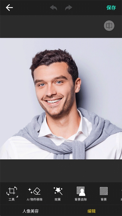 3、还能对人像进行柔肤、脸型调整、身材塑形等操作,完成后点击右上角的保存按钮即可;