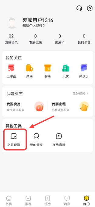 1、用签合同时预留的手机号注册登录“我家”平台,之后在“我的”界面里点击【交易查询】选项。