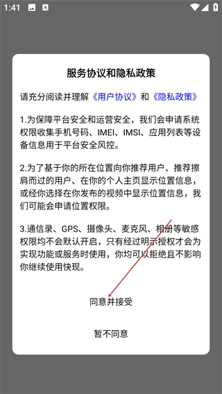 在阅读【服务协议与隐私政策】后,您可以点击【同意并接受】按钮以继续使用本应用;若您选择【暂不同意】,则将无法继续使用。