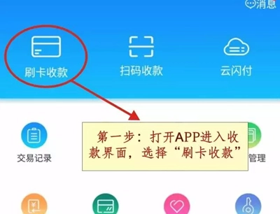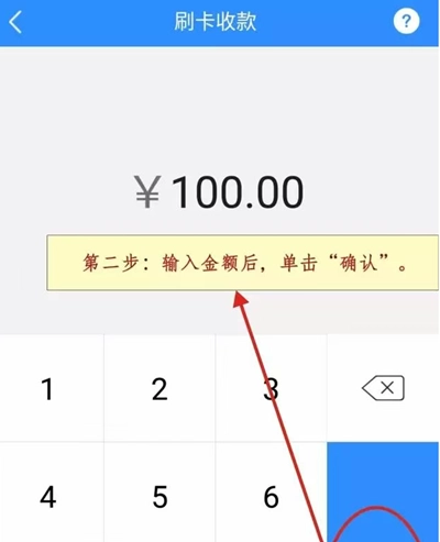 ①.在【收款】模块里找到【消费】选项并点击,进入相应页面后输入刷卡金额,接着点击确认交易按钮,这时手机屏幕上就会显示“请刷卡/插卡”的提示。