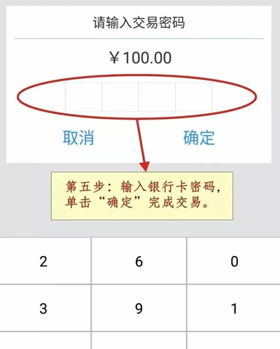 ②. 与设备相连的POS机也会同步显示消费交易的具体金额,持卡人需先核对金额是否正确。确认无误后,将银行卡(芯片面朝上、正面朝内)从POS机右侧的插卡口插入。POS机短暂读取卡片信息后,屏幕会显示该银行卡的卡号,此时在POS机上按下确认键。随后,持卡人需要输入银行卡的支付密码并点击确定,若屏幕提示“交易成功”,则表示此次消费交易已顺利完成。