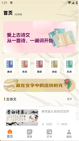 2. 首页就有唐诗、宋词、楚辞等分类板块,大家可以根据自己的需要去挑选。