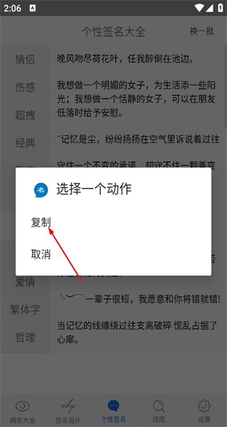 在弹出的“选择一个动作”弹窗中点击“复制”选项,就能把选中的个性签名复制到剪贴板了。