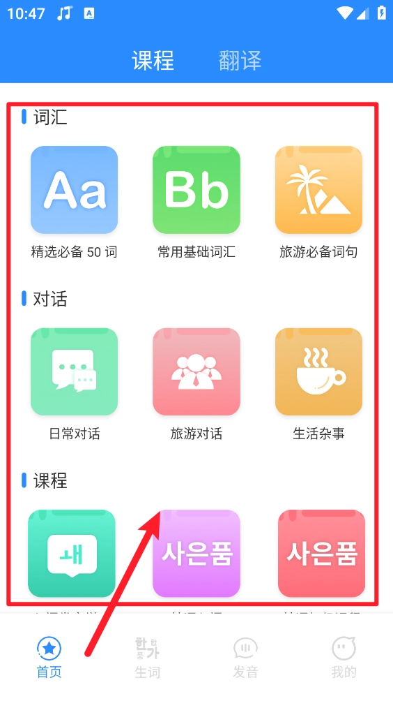 2、进入首页后,涵盖词汇、对话、课程等内容,任意打开其中一项即可开始学习。