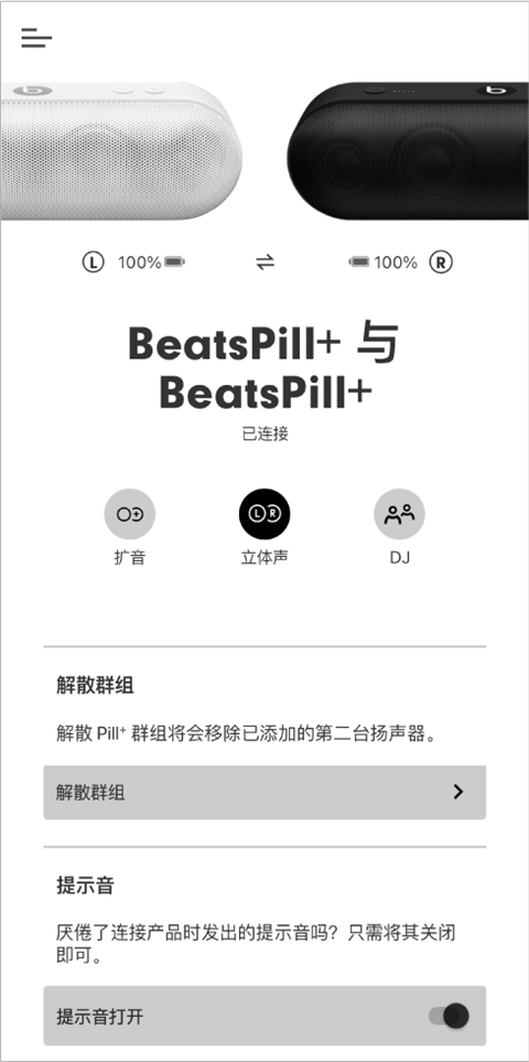 可以借助 Beats App 来创建由两台 Pill+ 扬声器组成的立体声群组,让其中一台作为左声道,另一台作为右声道。