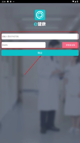 2、进入e健康页面后,在对应的输入框中填写手机号码,获取验证码并填入,点击“确定”按钮完成验证操作。