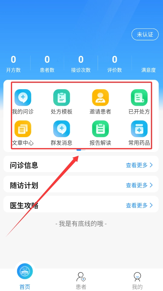 1、进入软件首页即可看到开方数与问诊信息,点击底部导航栏就能切换至患者管理页面。