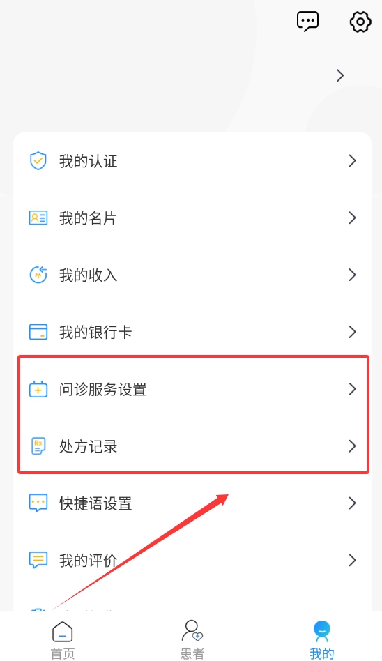 4、若需要调整接诊相关设置,可前往“我的”页面找到“问诊服务”选项,该选项位于银行卡与处方记录之间。
