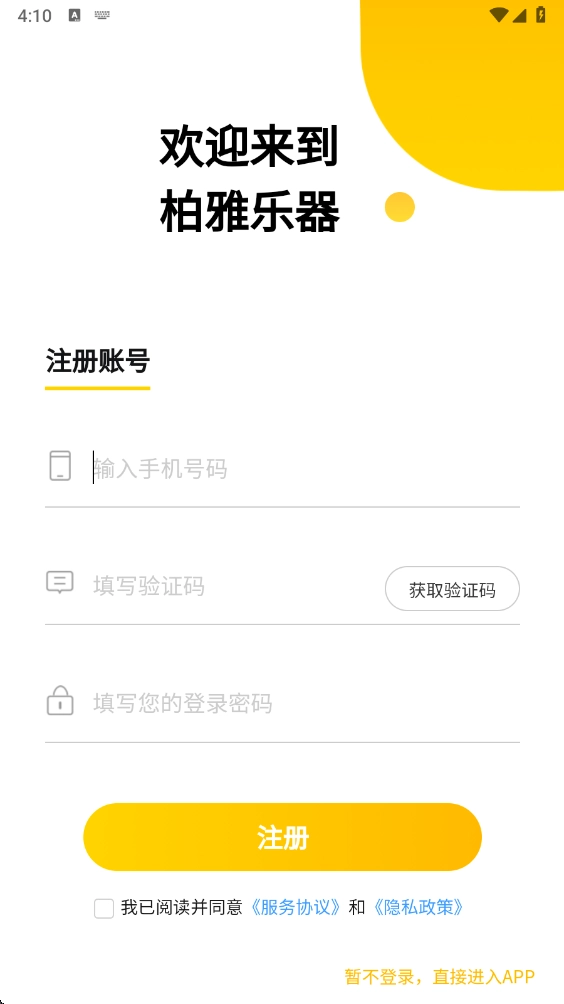 1.启动柏雅乐器应用后,输入手机号码与密码完成登录操作。