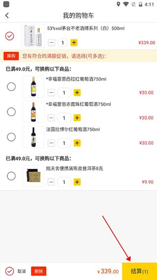 4、到购物车中,勾选自己需要的酒水,点击结算