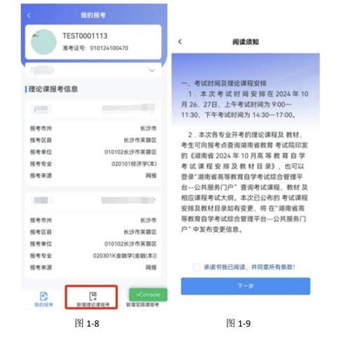第四步课程报考及确认操作步骤如下:首先点击图1-8报考界面下方的“新增理论课报考”图标,进入图1-9界面;接着仔细阅读阅读须知,勾选“承诺书我已阅读,并同意所有条款!”后点击“下一步”按钮,进入图1-10界面;随后依次选择报考市州、报考区县、报考单位、报考专业及开考课程(报考课程),再次点击“下一步”按钮,进入图1-12界面;最后点击“确认”按钮,即可锁定本次报考名额。