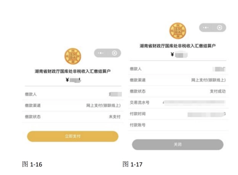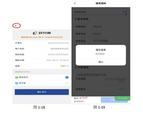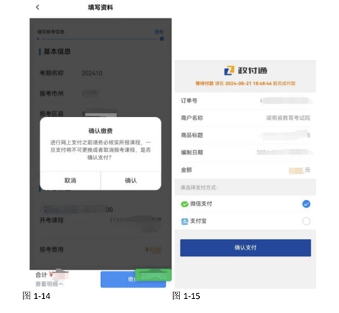 第五步缴纳考试费上图1-13界面,点击“缴费”按钮,进入图1-14界面,请核实报考课程后点击“确认”按钮,进入图1-15界面,点击“确认支付”按钮,进入图1-16界面,点击“立即支付”按钮,输入支付密码完成支付后,进入图1-17界面,显示缴费状态为“支付成功”即可点击“关闭”按钮完成支付流程。注:课程确认后不可更换报考课程,缴费后不支持退款。