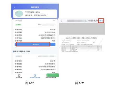第六步回执单缴费完成后,进入相关页面,显示图1-18界面时,点击左上角的“<”按钮,返回报考界面(如图1-19所示),接着点击“确认”按钮,进入图1-20所示界面,再点击“回执单”按钮,进入图1-21所示界面,最后点击右上角的“保存”按钮,即可将回执单保存至本手机。