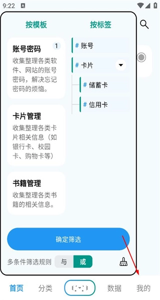 完成登录操作后返回分类页面,能看到账号密码等模板选项,可挑选对应的模板来开展信息管理工作。