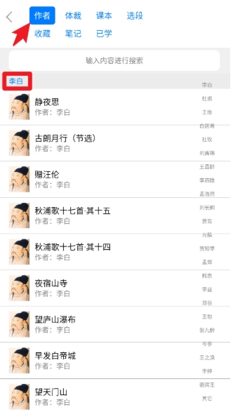 3、支持按“作者”分类检索,比如选定“李白”,就能浏览他的全部诗词作品。