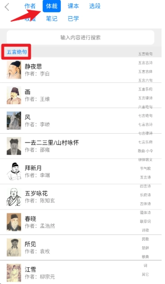 4、也能依据“体裁”进行分类查找,像“五言绝句”这类,就能快速找到对应的诗词。