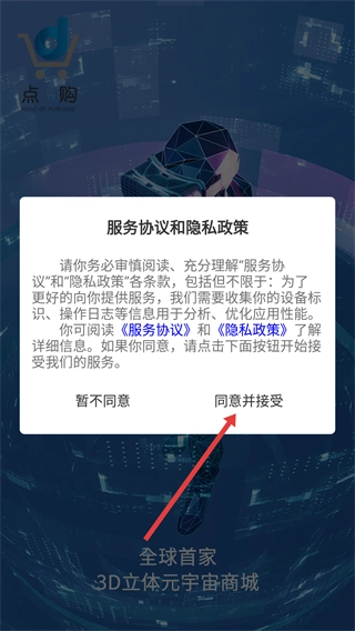打开【点购】应用后,页面会弹出【服务协议和隐私政策】的提示窗口,点击窗口中的【同意并接受】按钮,就能进入这个3D立体元宇宙商城的主界面了。