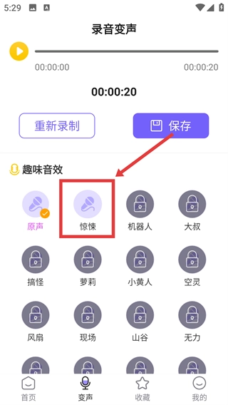 挑选目标音效(例如“惊悚”),确定后点击【保存】按钮,即可完成变声音频的处理和存储。