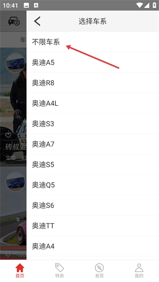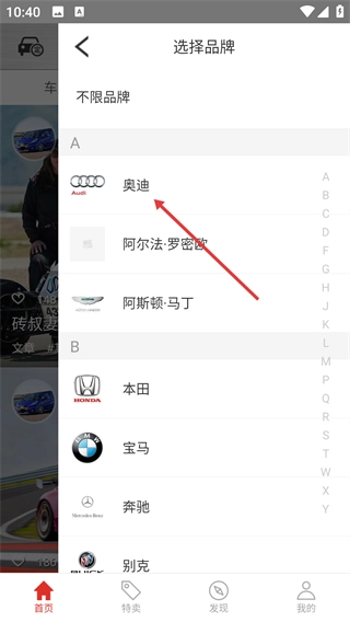 点击【车型】选项进入品牌选择页面后,能够挑选【奥迪】等品牌,进而筛选出该品牌改装车辆的相关内容。