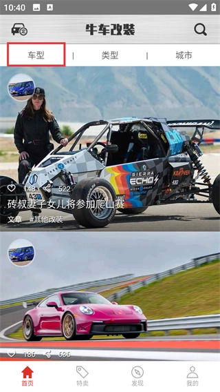 进入牛车改装首页后,你可以利用【车型-类型-城市】这一筛选条件,来查看各类改装车辆的相关内容,当然也能直接浏览平台推荐的内容。