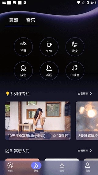 FLOW界面支持每日打卡,设有冥想入门、快速冥想、提升专注、关系处理、诗歌冥想等功能模块;向下滑动页面,还能浏览各类推荐活动与精选课程。