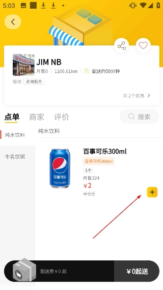 3、在【JIMNB】店铺页面找到【百事可乐300ml】商品,点击其旁边的+号,即可将该商品添加至订单中。