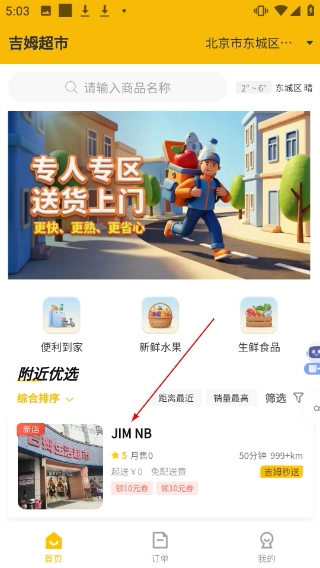 2、在【吉超超市】首页点击【JIMNB】,即可进入该店铺的点单页面。
