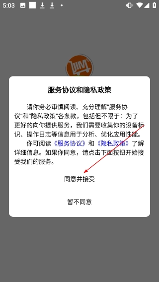 在【服务协议和隐私政策】弹窗里点击【同意并接受】按钮,即可进入应用的主页面。