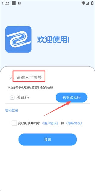 2、于登录页面输入手机号,勾选相关协议后,点击“获取验证码”按钮。