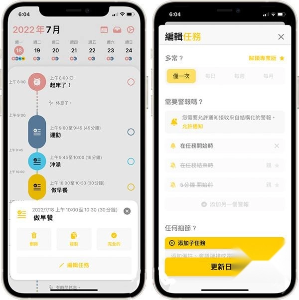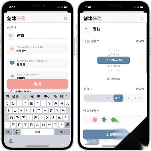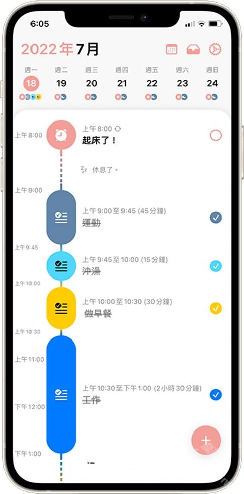 现在我们来添加新的待办事项或活动安排。请点击右下角的+按钮,输入活动或事项的名称,接着设置时间和行程时长。你还可以自定义标签颜色,要是你已经付费解锁,还能为固定行程设置自动重复的功能。