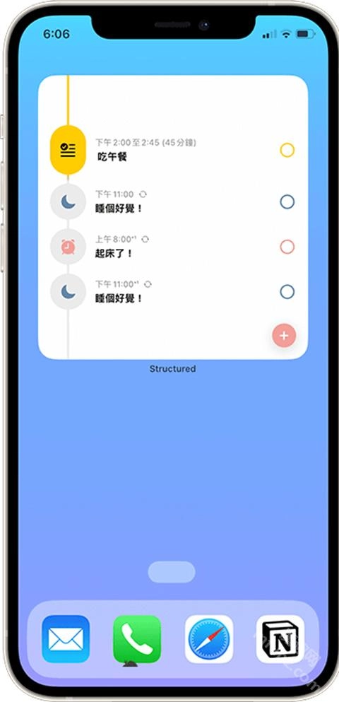 Structured还支持把每日计划放在桌面方便快速查看。操作很简单,只要点击桌面空白区域,按下左上角的“+”号,接着选择“Structured”,再选一个你心仪的小工具尺寸,就能添加到iPhone桌面了。