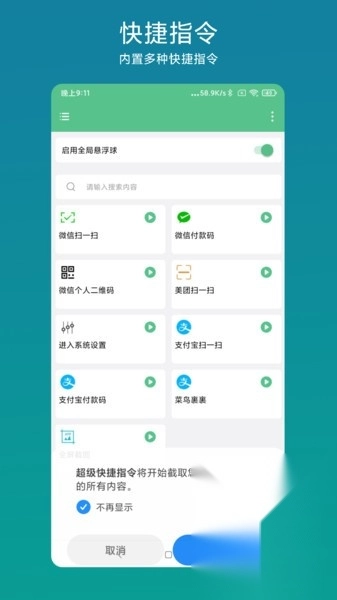 超级快捷指令是一款简洁实用的安卓快捷指令设置工具,用户能借助其手机版设置截图、扫码支付、收能量等各类快捷操作指令。该软件的核心优势在于快捷指令设置流程十分简便,用户可依据自身需求自由配置,轻松添加快捷手势,让手机使用体验更便捷舒适。